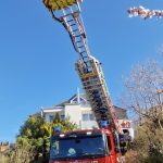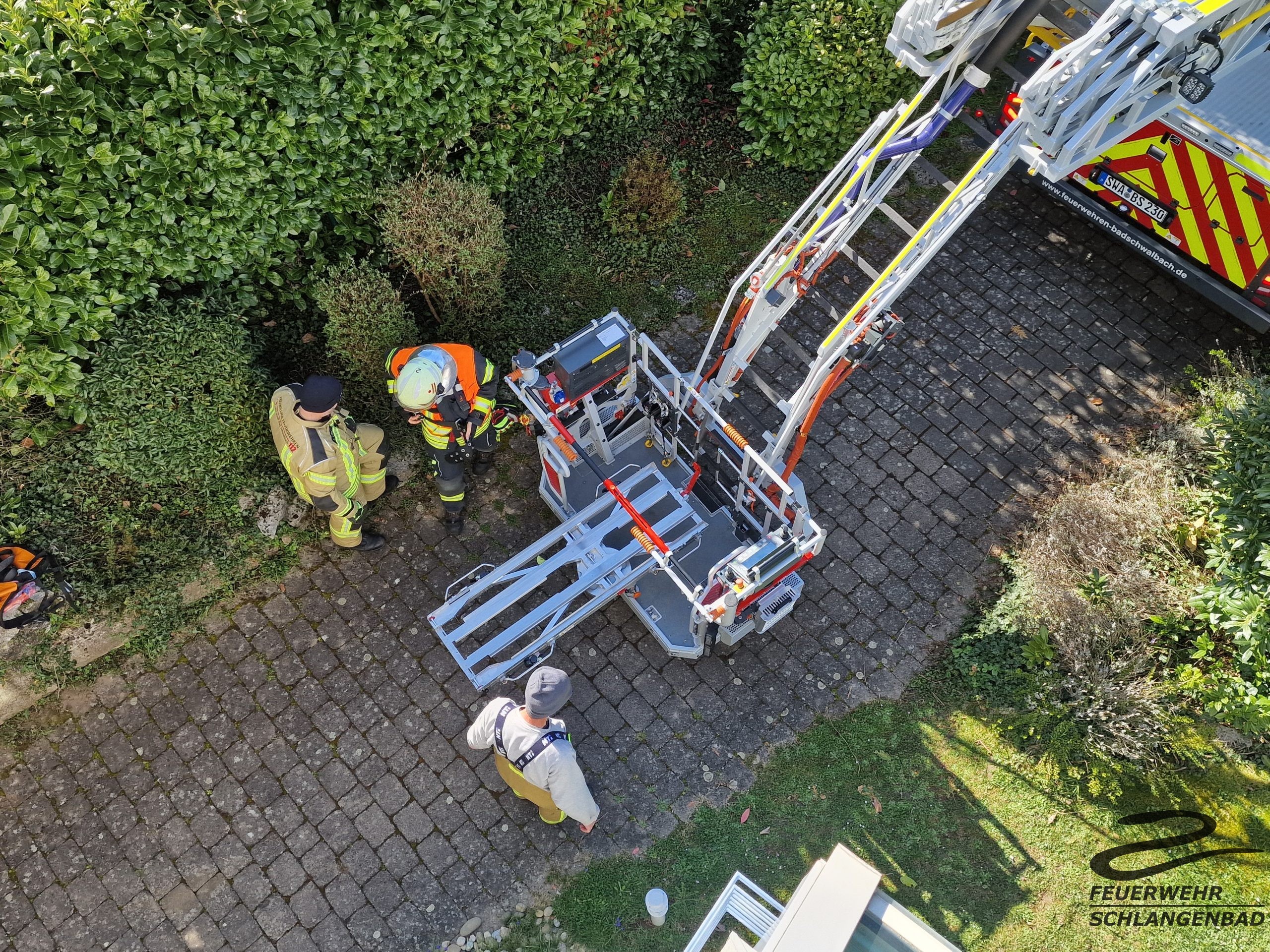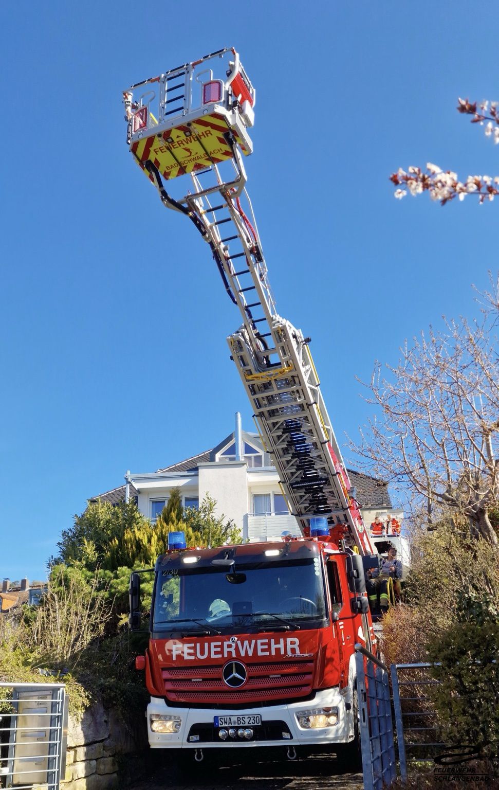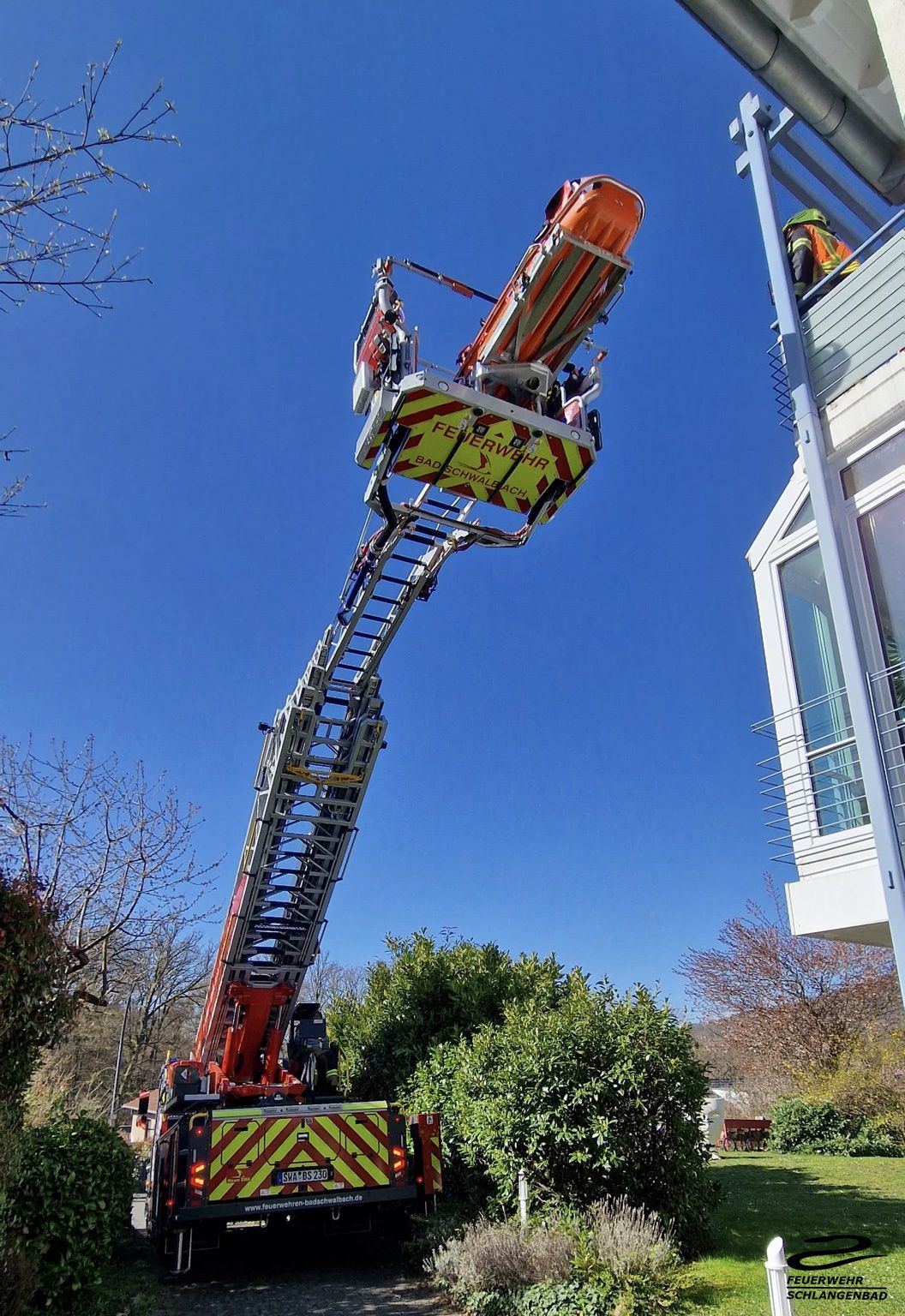 Die Drehleiter wurde in der engen Hauseinfahrt positioniert und der Korb mit dem Modul zur Aufnahme einer Schleifkorbtrage ausgestattet. Anschließend wurde der Balkon im zweiten Obergeschoss zur Straßenseite angeleitert. Die Patientin wurde mittels Schleifkorbtrage über den Balkon in den Drehleiterkorb verbracht und schonend nach unten gefahren. Nach dem Umlagern übergaben wir die Patientin an den Rettungsdienst, der sie anschließend mit dem Rettungswagen in eine Klinik transportierte.