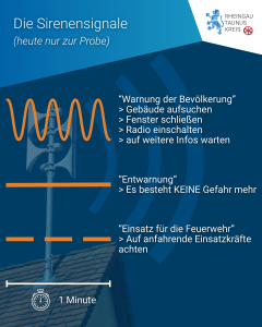 In jeder Stadt und Gemeinde wird um 10:00 Uhr der Warnton „Warnung der Bevölkerung“ sowie um 10:30 Uhr „Entwarnung“ über die Sirenen abgespielt.